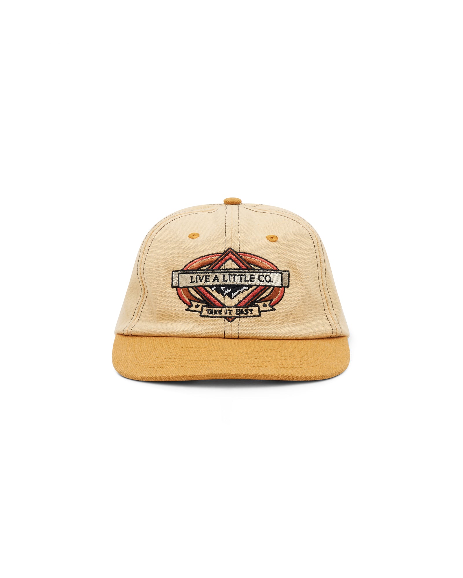 6 panel 2 tone 100% cotton canvas vintage hat. Featuring a retro designed embroidery on the front. A perfect hat for taking it easy.